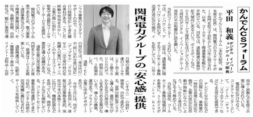 日本流通産業新聞(2021年10月28日号)の「コールセンター特集」(2面・3面)に、当社 平田和義(デジタル イノベーション グループ マネジャー)のインタビュー記事が掲載されました。